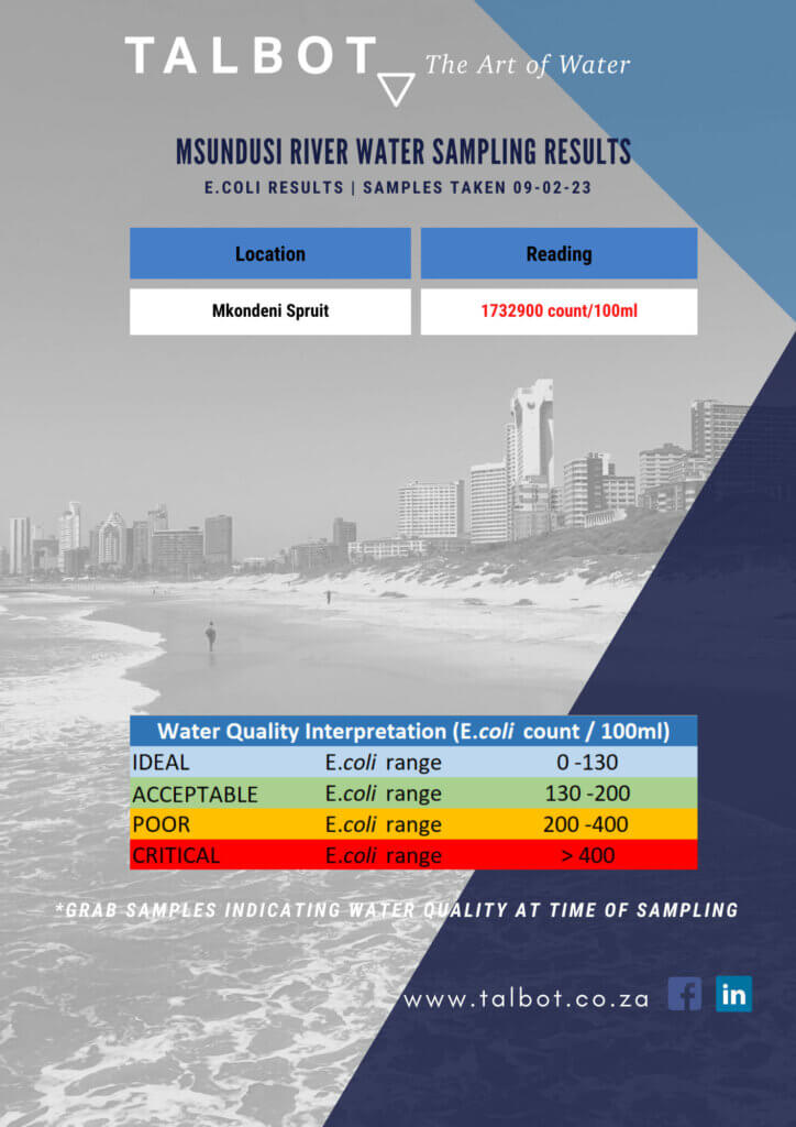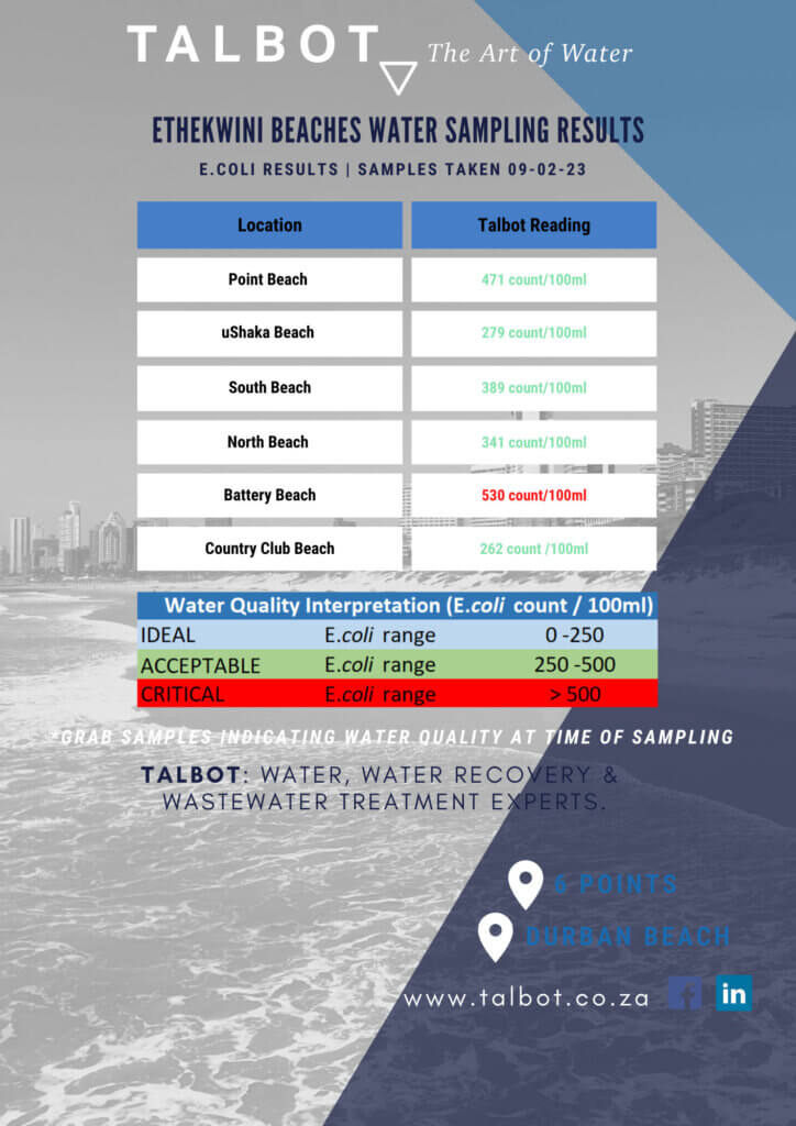 Water Quality Testing Results 09-02-2023HomeWater Testing ResultsWater Quality Testing Results 09-02-2023 View the test results for E.coli in the various Durban beaches and surrounding rivers. For all our testing results click here
